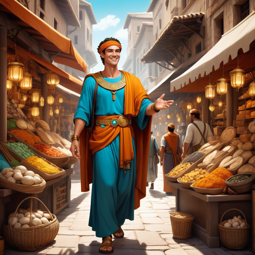 A smiling young man dressed in a blue Roman toga and yellow tunic walking confidently through a busy ancient marketplace. He carries a decorated leather satchel and wears bronze sandals and accessories. The street is lined with market stalls displaying fresh produce under hanging lanterns, with Mediterranean-style buildings and clear blue sky in the background.
