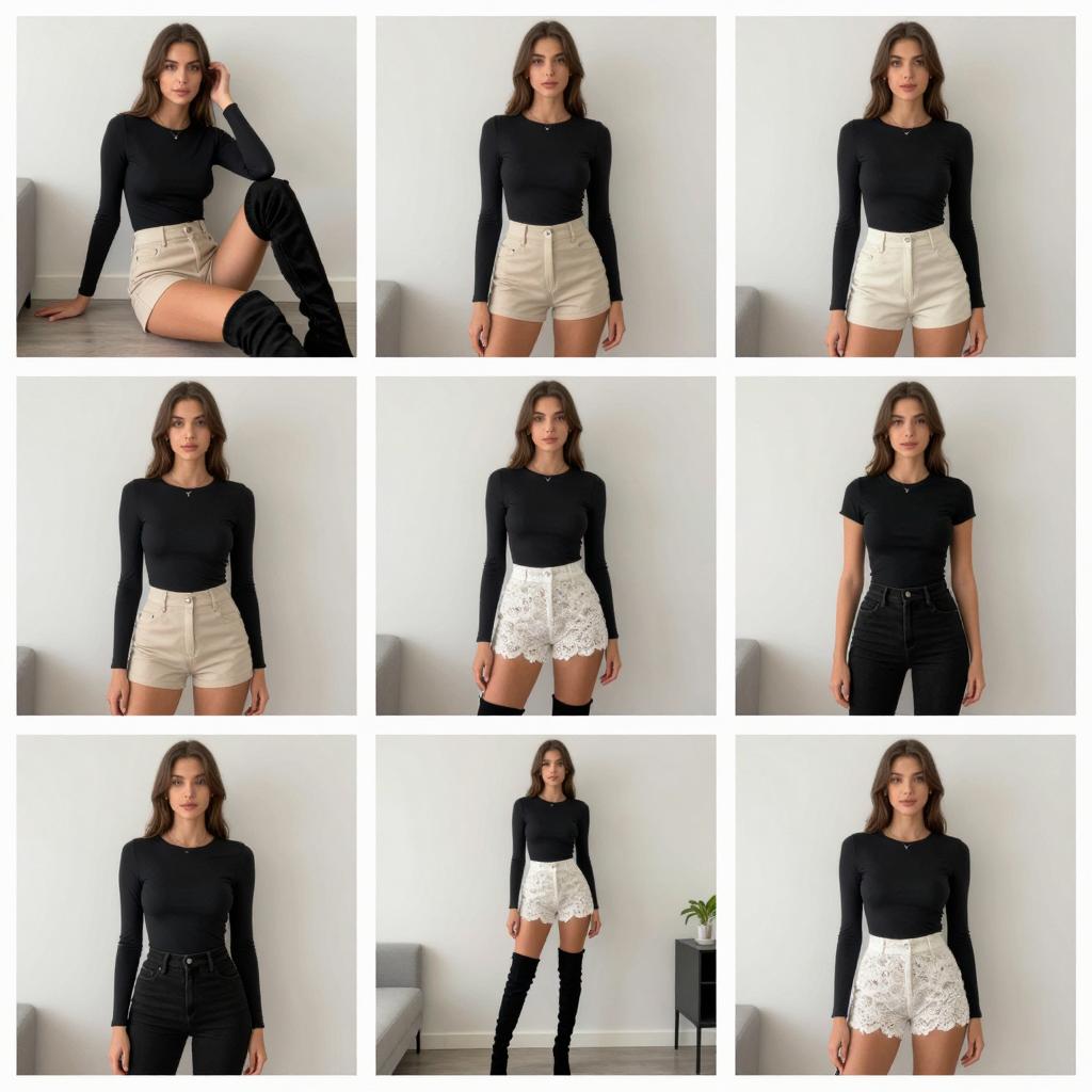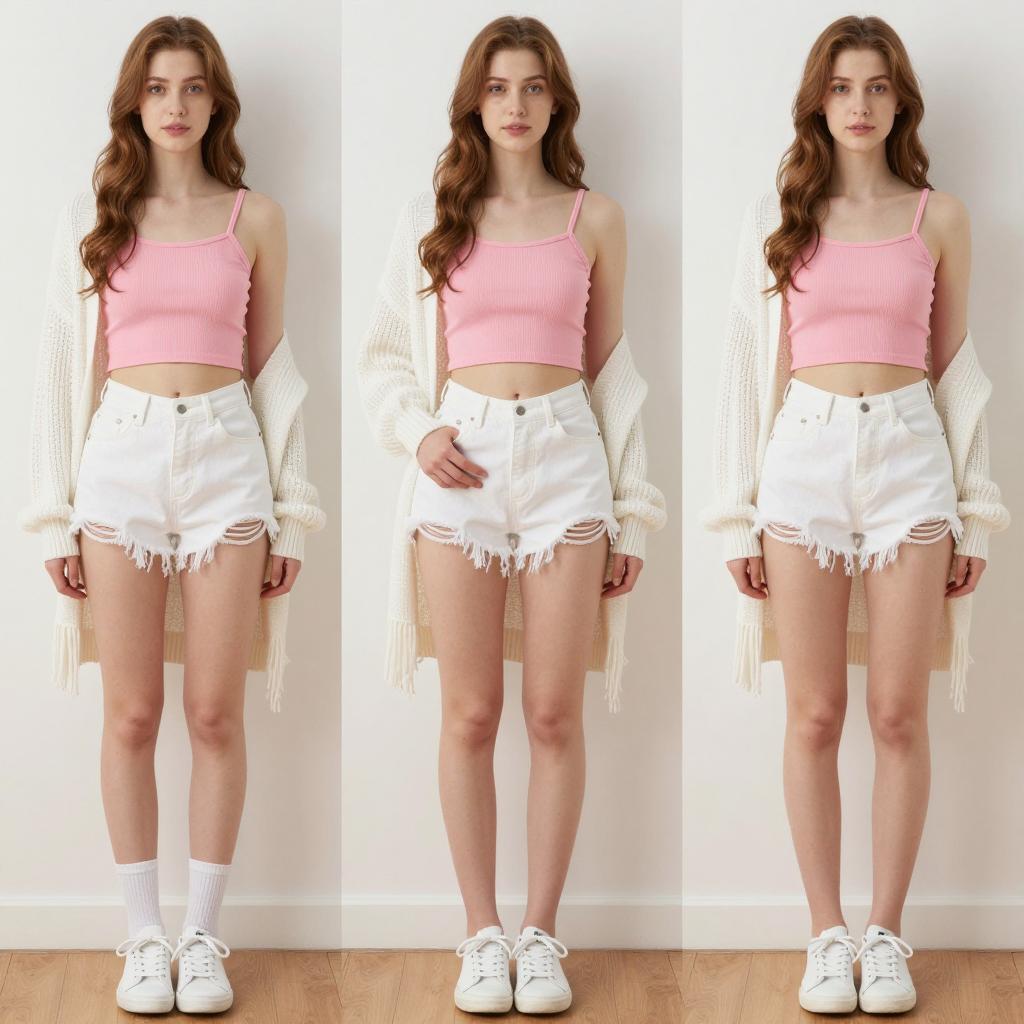 Three photos of a young woman with long, wavy, light brown hair. She wears a pink ribbed crop top, white high-waisted, frayed denim shorts, and a white knitted cardigan. She stands in a white room with light wooden floors. In the first photo, she wears ankle socks. In the second and third photos, she wears white sneakers. Her right hand is on her shorts in the second photo. The cardigan has fringe details.
