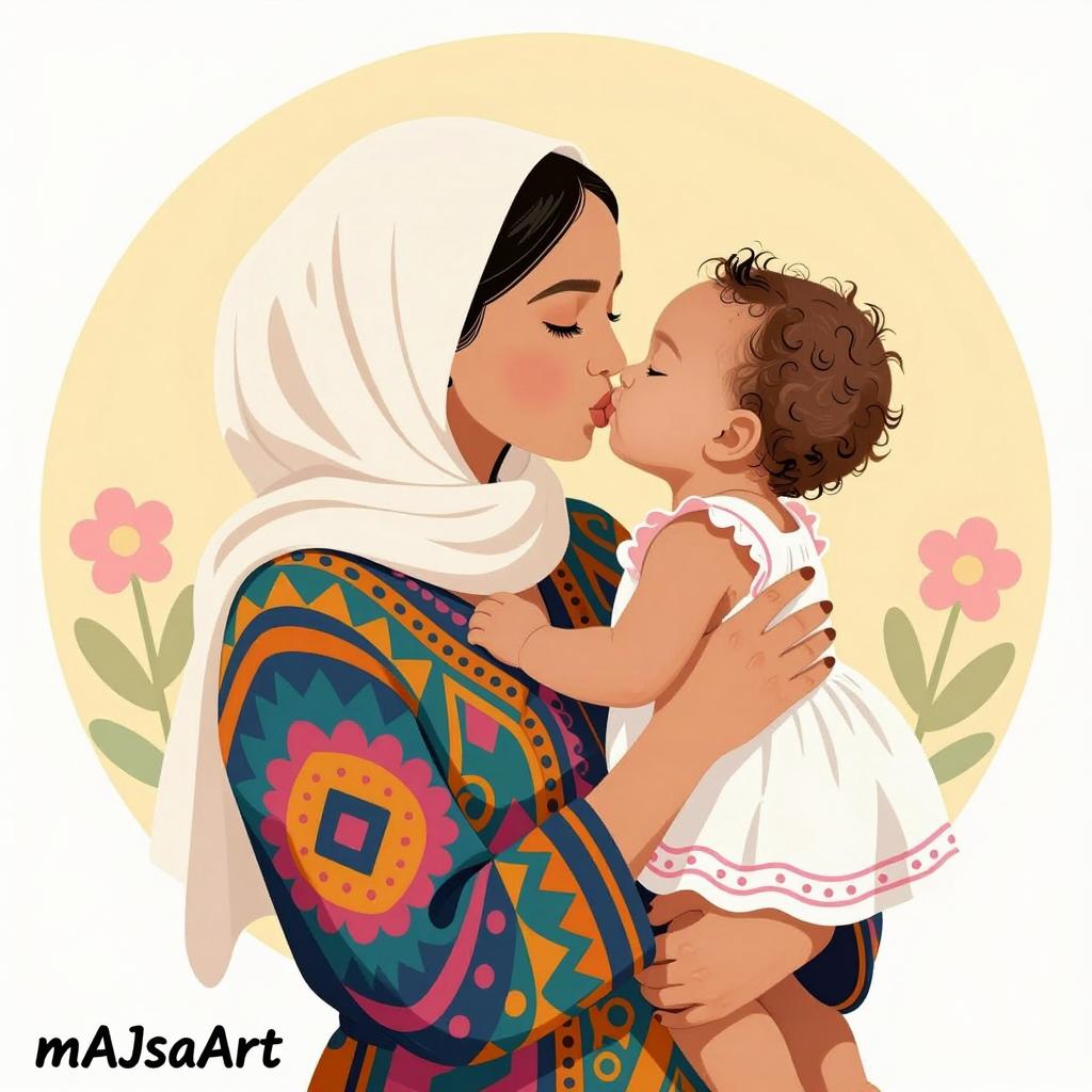 Illustration of a woman in a white headscarf holding a sleeping baby in a yellow headscarf. Woman's profile shows closed eyes and calm expression. Baby's face is relaxed, eyes closed. Dark background. Geometric, digital art style. Woman's right arm supports baby's head. Soft, warm colors. Both wear light, draped clothing. Black background. Two people.