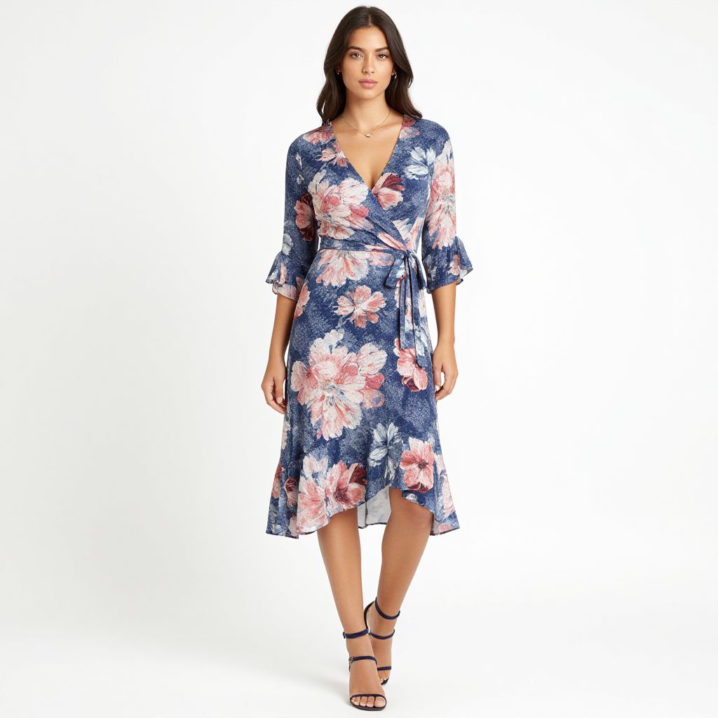 "Woman, contemporary, wrap dress with bold floral print in hues of blue, pink, and white, V-neckline, three-quarter sleeves, knee-length with ruffle detailing, belted waist, navy blue strappy sandals, minimalist jewelry, natural makeup, bright studio background. Sexy. Pretty face and beаutiful eyes. Big breasts."