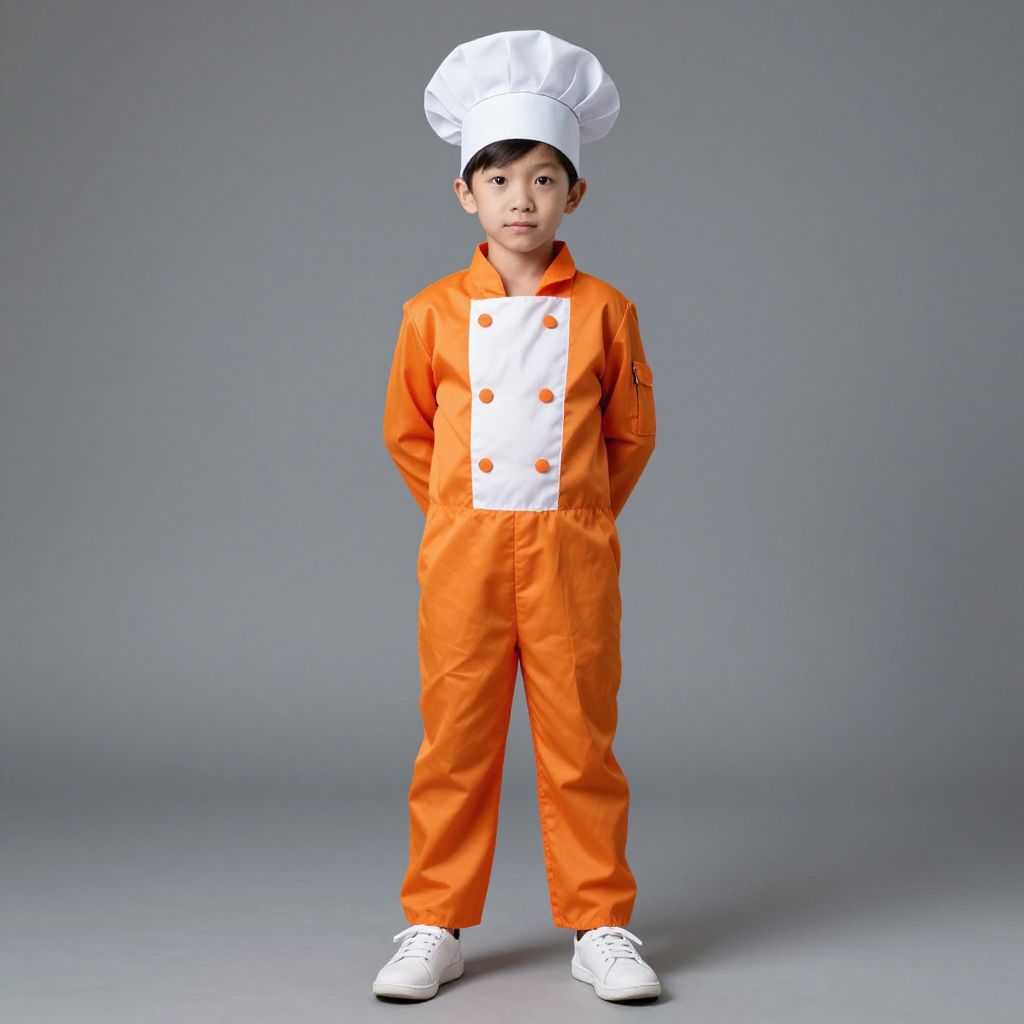 Photograph of an Asian boy in an orange jumpsuit and white chef hat, standing with hands in pockets, against a gray background.