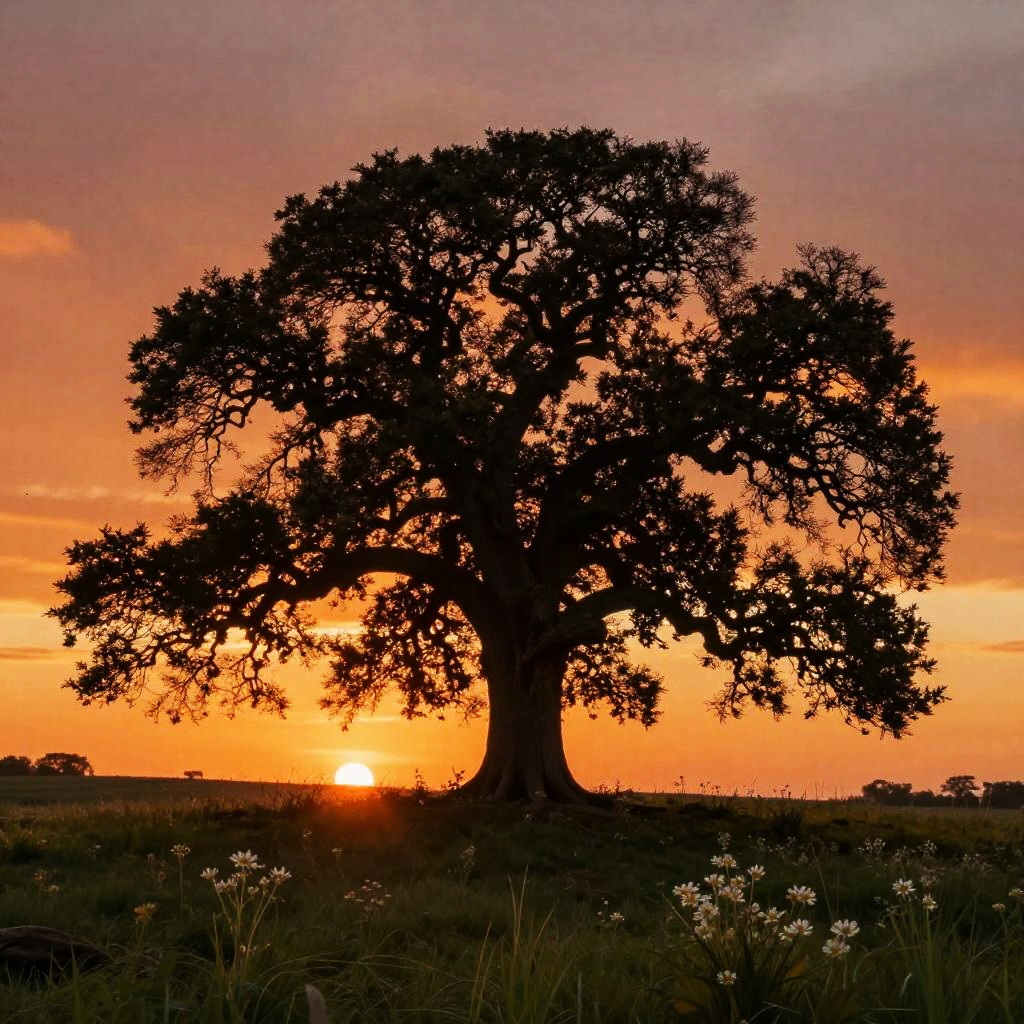 Farr ancient oak tree standing alone on a grassy hill at sunset, sprawling branches silhouetted against fiery orange sky, delicate wildflowers around trunk, mystical and tranquil atmosphere, painterly style with emphasis on light and shadow.