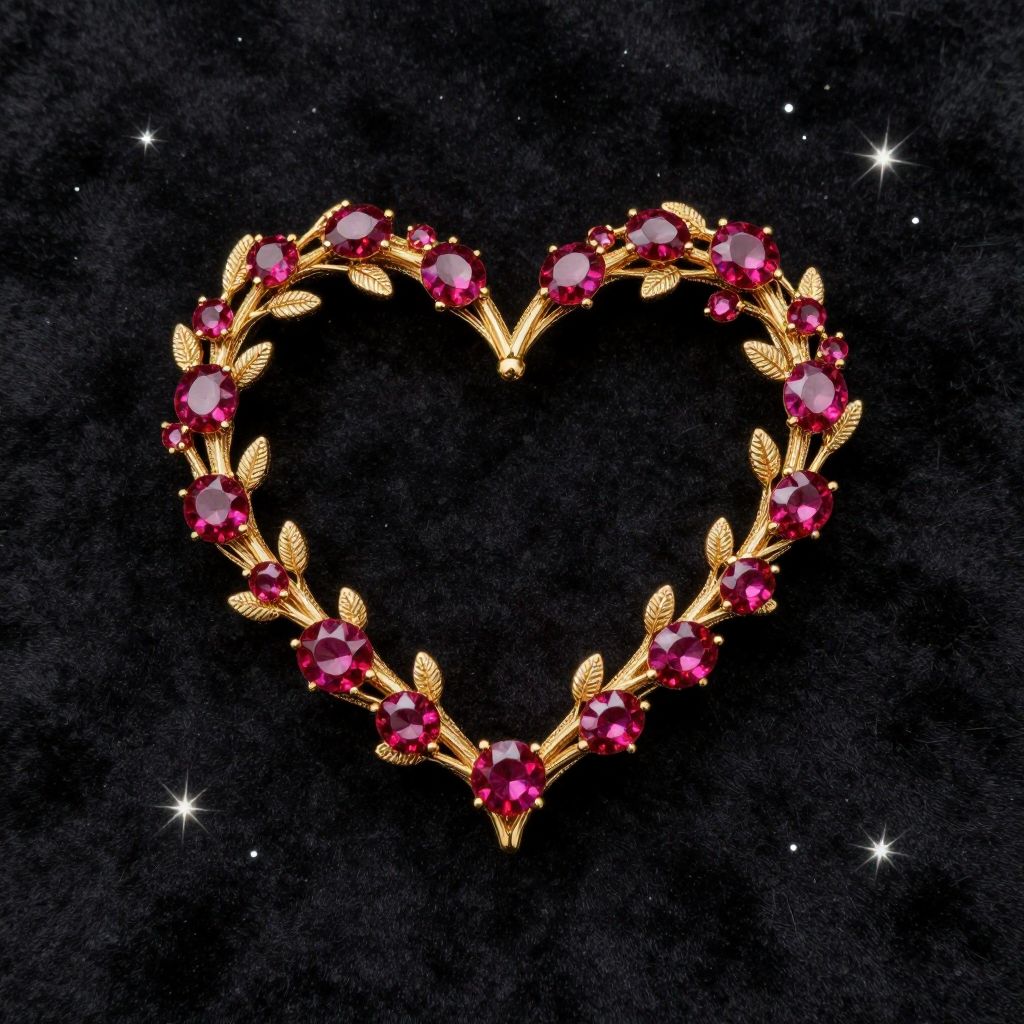 A stylized herz symbol crafted from intertwining golden branches and radiant ruby gems, set against a dark velvet background with specks of twinkling stars, evoking warmth and elegance in a magical realism style.
