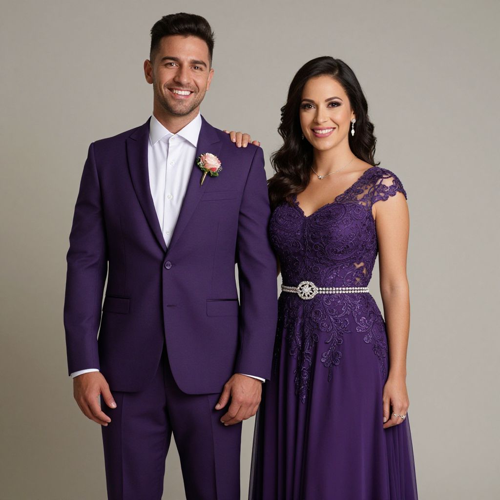 Elegantly coordinated couple in matching purple attire, featuring a man in a sharp suit with a floral boutonniere and a woman in a flowing prom dress with intricate lace detailing and a sparkling belt, both smiling warmly against a neutral backdrop.