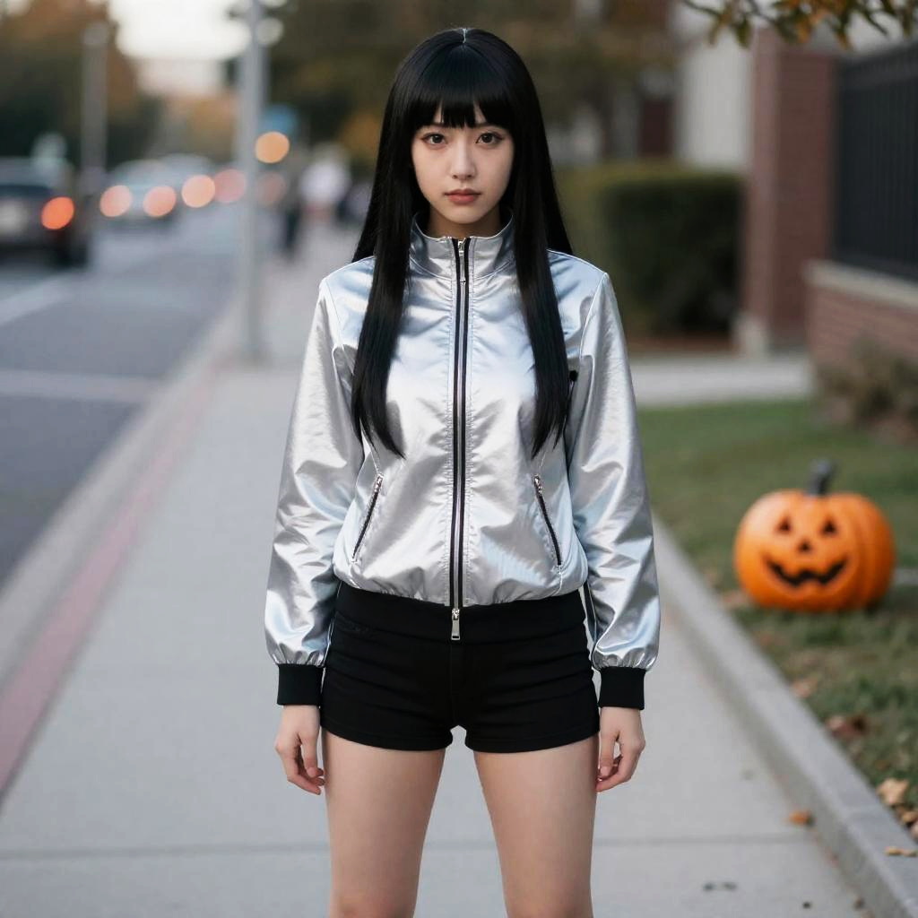 Asian woman with long black hair, silver jacket, black shorts, standing on suburban sidewalk, blurry background, orange Halloween pumpkin on right. Photograph.