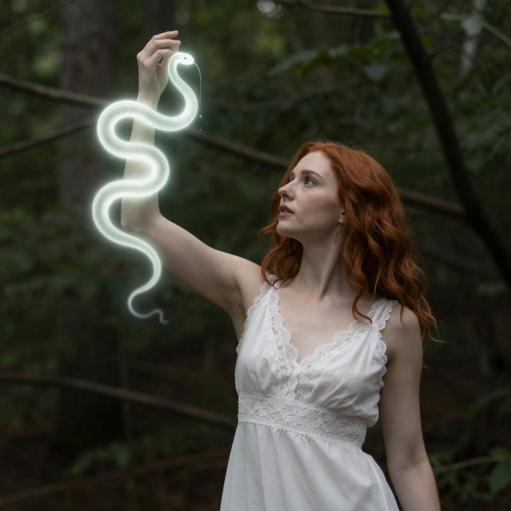 Photograph of a fair-skinned woman with red hair, wearing a white, lace-trimmed dress, standing in a forest. She raises her right arm, with glowing, ethereal, snake-like light swirling around her left arm. Dark green foliage and tree branches form the background.