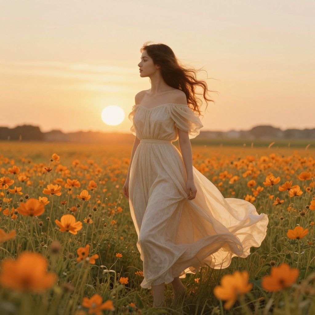 Woman stands gracefully amidst rows of vibrant yellow tulips, her flowing golden dress complementing the sea of blossoms that stretches toward a misty horizon.