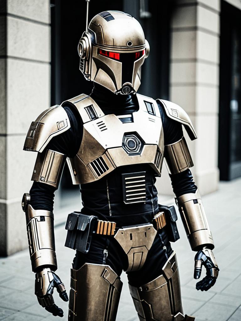 Full-body portrait of a man wearing a realistic Commando Droid costume from Star Wars, featuring metallic gold armor plates and a black bodysuit. The setting is an outdoor park pathway lined with trees, providing a natural blurred background.