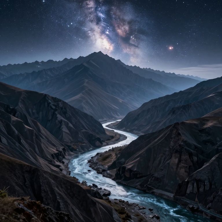 Photograph of a stunning night landscape featuring a winding, illuminated river cutting through dark, rugged mountain ranges. The Milky Way galaxy, with its vibrant star clusters and bright central core, spans the night sky above the peaks. The mountains are shadowy and textured, with the river reflecting a blue glow. The sky is rich with stars, adding a celestial element to the scene. The overall color palette includes deep blues, blacks, and subtle whites, creating a dramatic, serene atmosphere. The perspective is from an elevated viewpoint, capturing the expansive, tranquil beauty of the natural landscape.