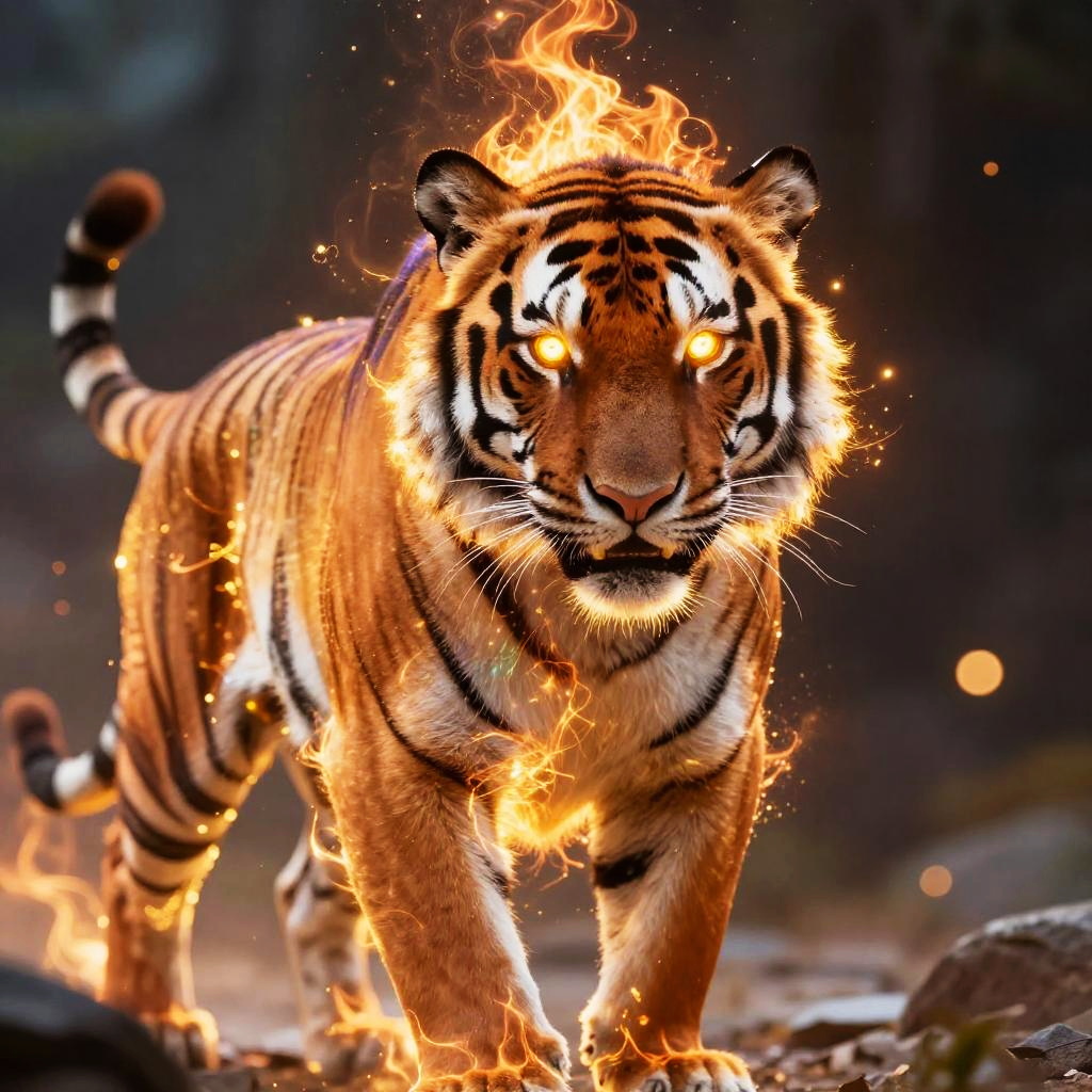 A white tiger dream in a mystical snowy landscape, glowing blue eyes piercing the darkness, detailed fur texture, ambient lighting, high contrast fantasy wildlife portrait