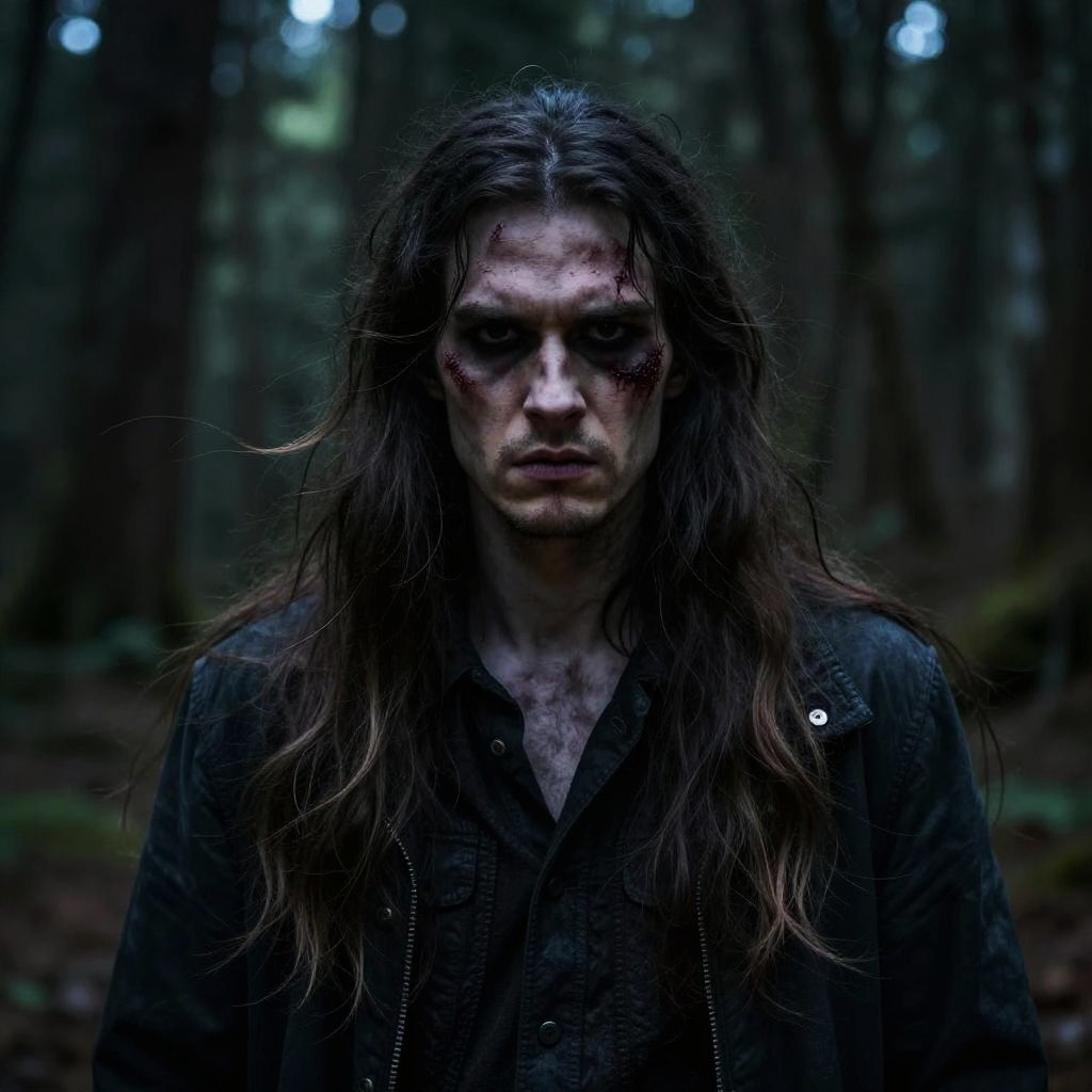 Photograph of a pale, disheveled man with long, dark, messy hair and bloodied face, standing in a dimly lit, dense forest. He wears a dark, worn-out jacket with visible buttons, over a black shirt. His expression is intense and haunted, with dark, hollow eyes. The forest background is blurred, with tall trees and patches of moss, adding to the eerie, somber atmosphere. The lighting is low, emphasizing the man's troubled appearance and the gloomy setting.