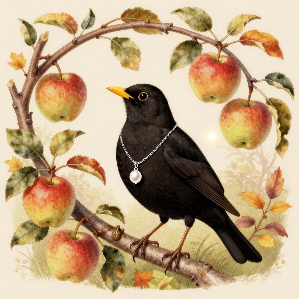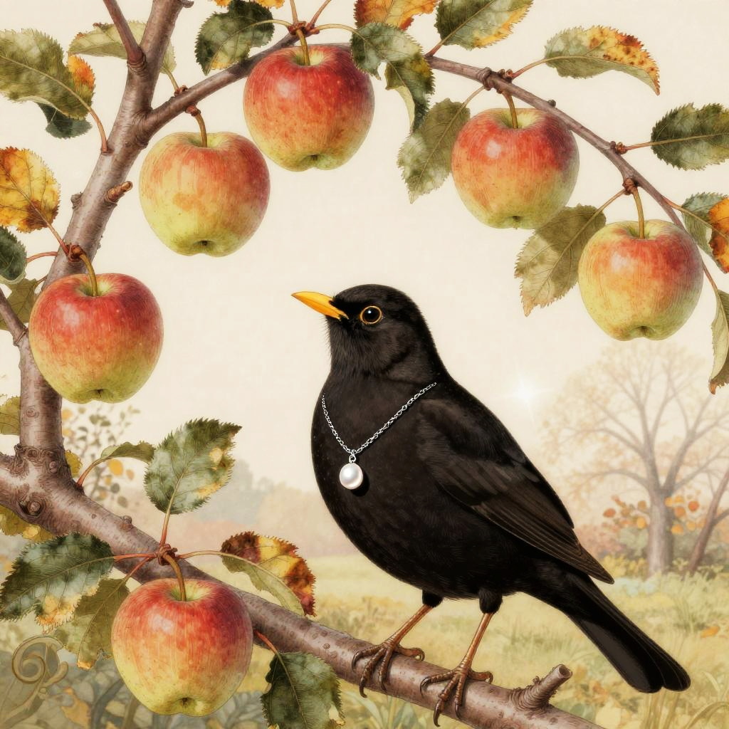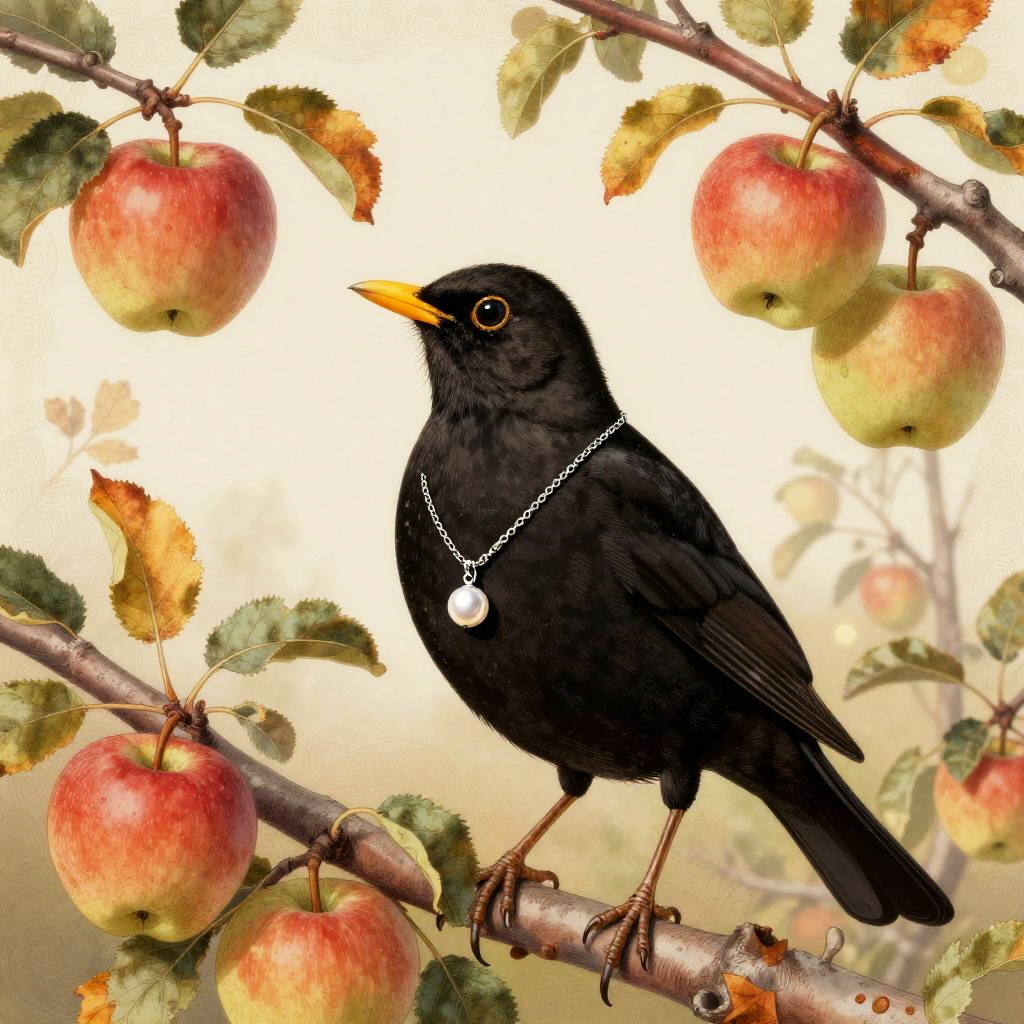A calm common blackbird wearing a delicate silver chain with a single pearl pendant, set in an ancient orchard bursting with ripened apples and early autumn hues, vintage illustration aesthetic with delicate linework and fine crosshatching, muted warm palette on a soft cream backdrop, ornate botanical detailing, gentle and charming atmosphere, soft rim lighting, subtle paper grain texture, balanced and symmetrical composition, slight vignette, natural bokeh sparkle, ultra clean edges, high fidelity details