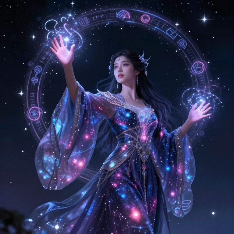 Digital art of an ethereal Asian woman in a glowing, starry dress, casting a magical circle with outstretched hands. Cosmic, celestial background