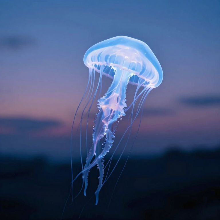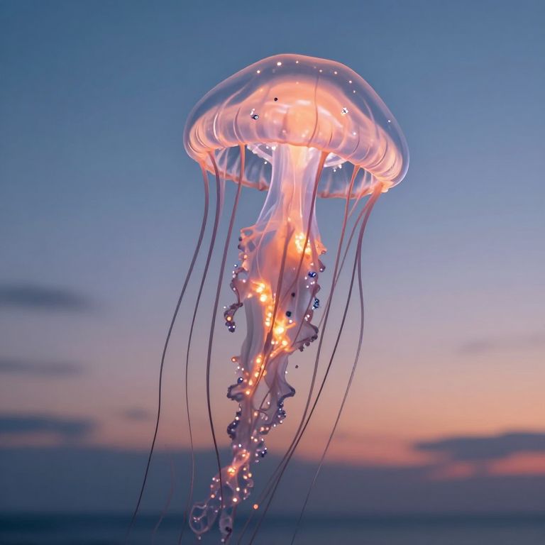 Photograph of a glowing, bioluminescent jellyfish with pink, blue, and white lights against a twilight sky with purple and pink hues.