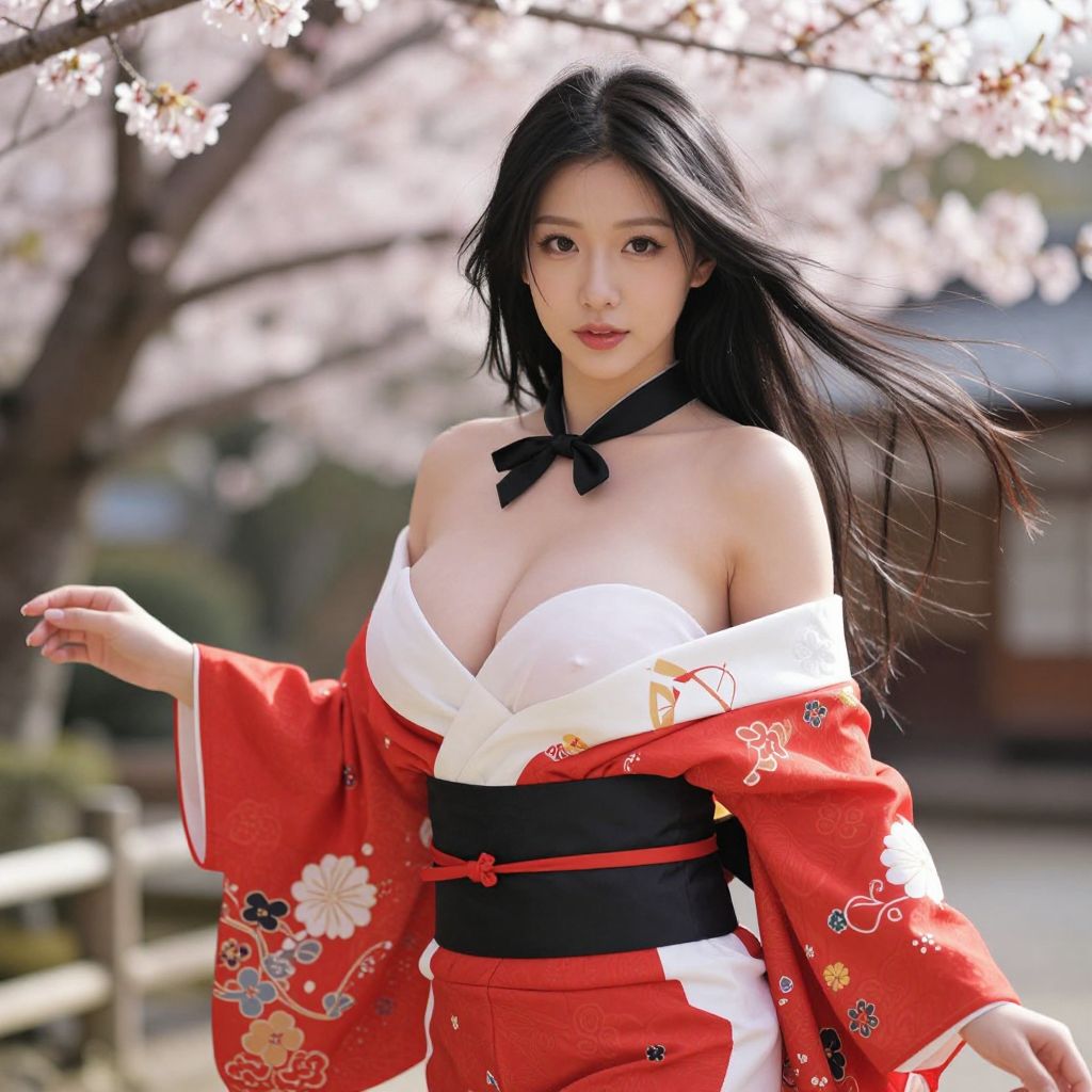 A beautiful Asian woman with big tits and a sexy, alluring presence stands in a traditional Japanese garden, wearing a stunning red and white kimono with a sleek black sash tied elegantly around her neck. The kimono flows gracefully in the breeze, highlighting her delicate features and graceful posture. Soft sunlight filters through cherry blossom trees, casting a warm, romantic glow. Her long black hair flows freely, and her eyes sparkle with confidence and charm. The scene is serene yet captivating, blending elegance and sensuality in perfect harmony.