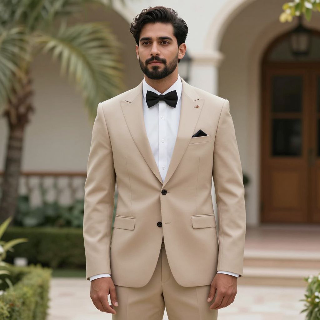 Photograph of a handsome man with medium brown skin and dark, wavy hair and beard, standing outdoors. He wears a light beige tuxedo with a black bow tie, white dress shirt, and black pocket square. The background features a blurred, elegant mansion with arched windows, a wooden door, and palm trees. The man looks serious and confident, with his hands relaxed by his sides. The image is sharp with vibrant colors, emphasizing the formal attire and sophisticated setting.
