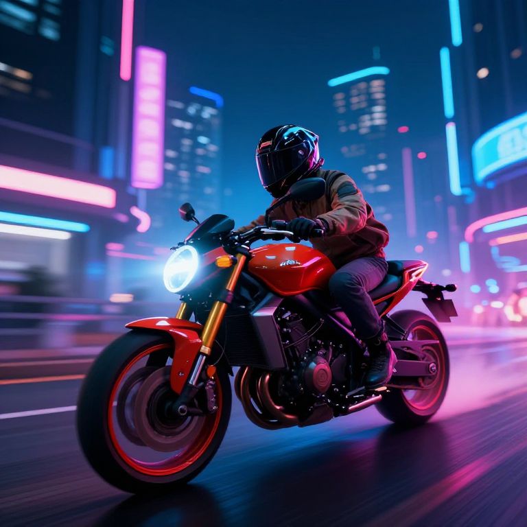 Shrimp motorcycle speeding through a futuristic neon cityscape at night, vibrant colors, dynamic motion blur, cyberpunk aesthetic, highly detailed, glowing lights