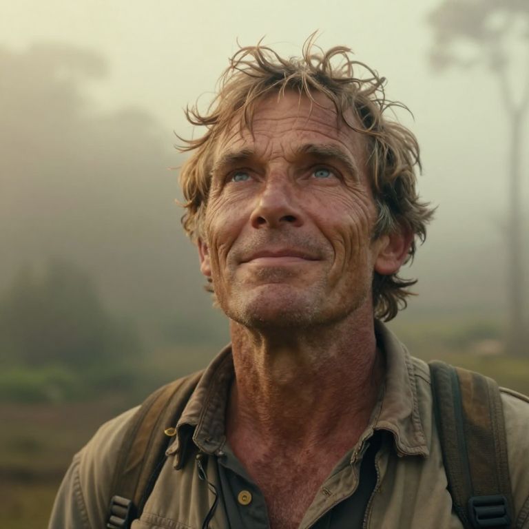 Photograph of a rugged, middle-aged man with tousled, dirty blonde hair and blue eyes, looking upwards with a slight smile. His weathered face shows signs of dirt and sweat, and his skin is slightly tanned. He wears a dirty, olive-green button-up shirt with shoulder straps of a backpack visible. The background is blurred, featuring a misty, green landscape with indistinct trees and a faintly visible structure. The lighting is soft and natural, highlighting his facial features and creating a sense of depth and realism.