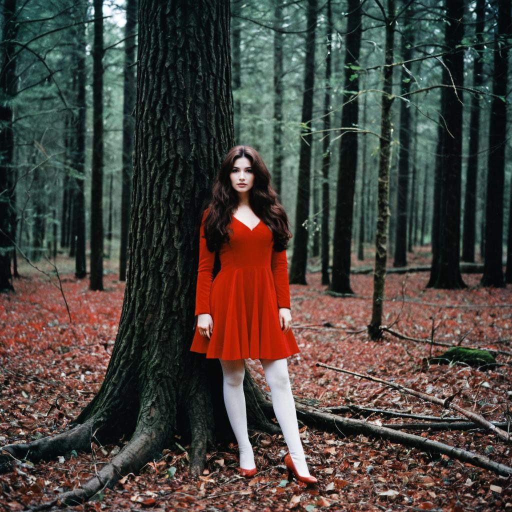 Haven clothing,1girl, solo, dress, long hair, tree, brown hair, outdoors, nature, forest, standing, looking at viewer, blue dress, day