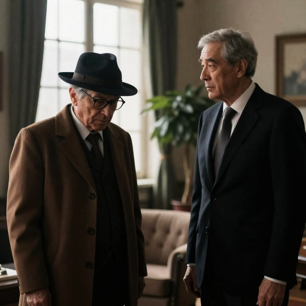 Four older men in black tuxedos with white shirts and black bow ties sit in yellow leather chairs. All wear black-rimmed glasses. Center has a gold ashtray. One man on the right smokes a cigarette. Dimly lit room, wooden paneling, and a door in the background.