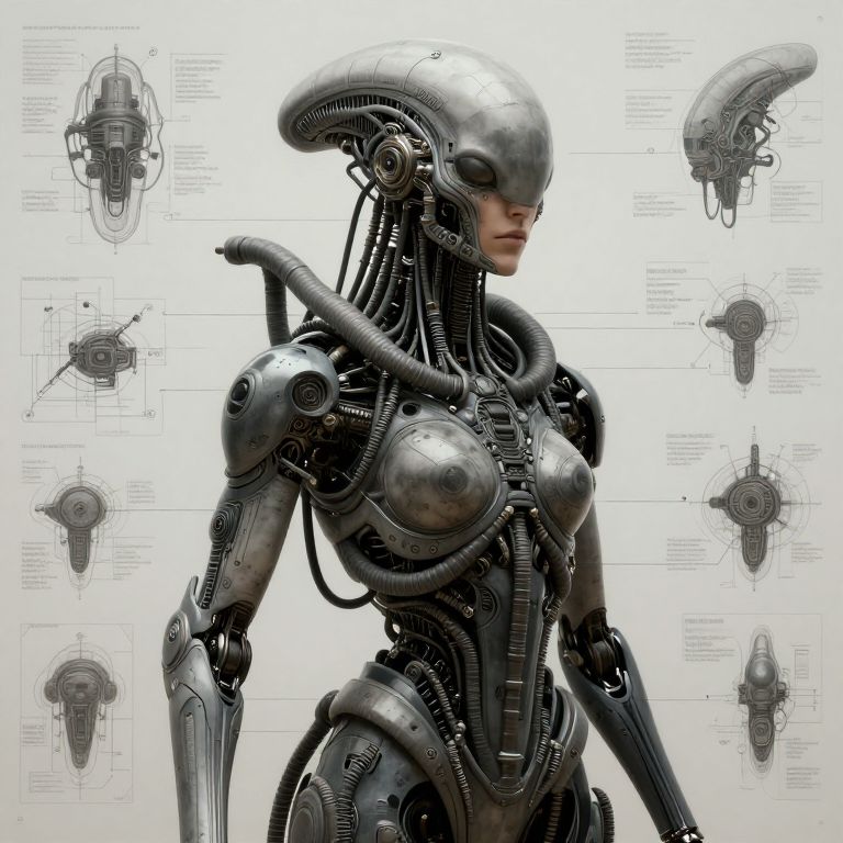 The image presents an intricate and highly detailed portrait of an advanced alien tech schematic. The central figure is a humanoid form adorned with elaborate mechanical and biological components, creating a striking juxtaposition of organic and technological elements. The headpiece is a complex assembly of pipes, wires, and mechanical parts, resembling a helmet or headdress, with numerous pipes and wires extending outward, suggesting a network of connections or a system of communication. The figure's body is similarly adorned with mechanical elements, with pipes and wires crisscrossing the torso and limbs, indicating a high degree of integration between the organic and mechanical aspects. The background features a series of diagrams and schematics, providing a detailed breakdown of the various components and systems, with annotations and labels in a stylized, editorial format. The overall composition is dense and layered, with the mechanical elements and schematics creating a sense of depth and complexity. The color palette is muted, with shades of gray and black dominating the scene, emphasizing the intricate details and the high level of craftsmanship. The image is a testament to advanced alien technology, blending organic and mechanical elements in a visually stunning and scientifically detailed manner.