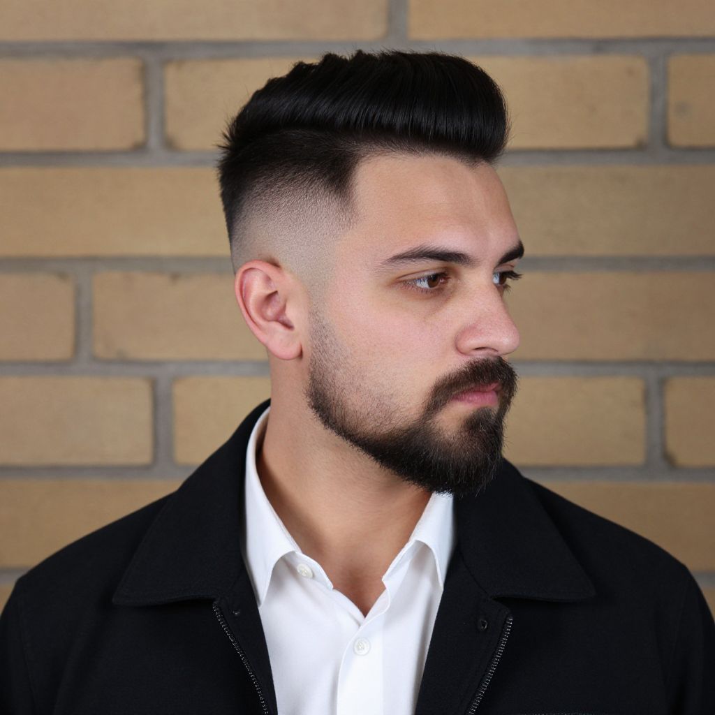 Photograph of a young man with light olive skin and dark hair styled in a slicked-back, undercut pompadour. He has a full, dark beard and is gazing to the right. He wears a black, zip-up jacket over a white, collared shirt. The background features a beige brick wall with gray mortar lines. The lighting is even, highlighting his facial features and hairstyle. The overall style is modern and stylish, with a focus on neat grooming and a classic, yet contemporary look.