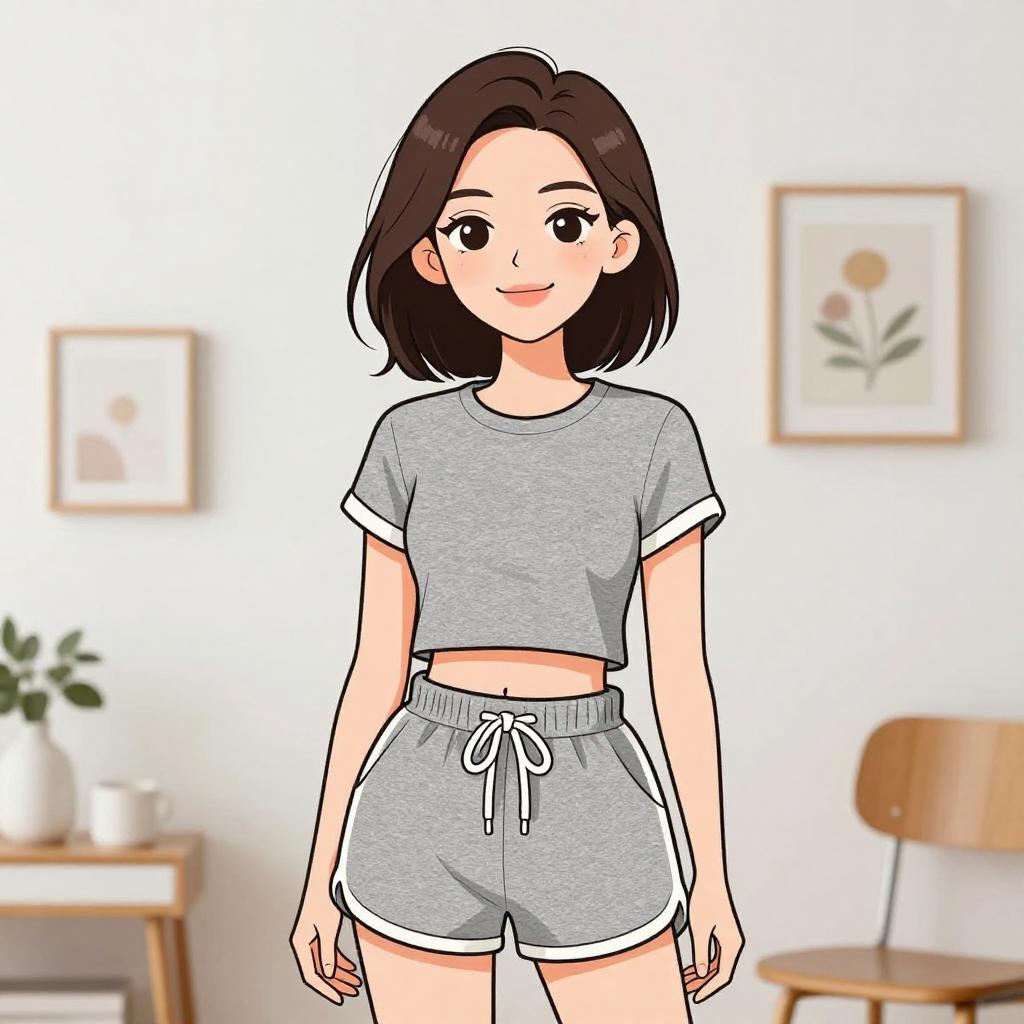 A digital drawing of a young woman with light skin and long brown hair, wearing a black sleeveless crop top and white drawstring pants. She stands in a minimalist living room with a light gray sofa and a framed abstract painting on the wall. The woman has a cheerful expression, with black eyes and a subtle smile. Her right hand is in her pants pocket. The background is simple and uncluttered, focusing attention on the woman. The style is cartoonish with clean lines and soft colors.
