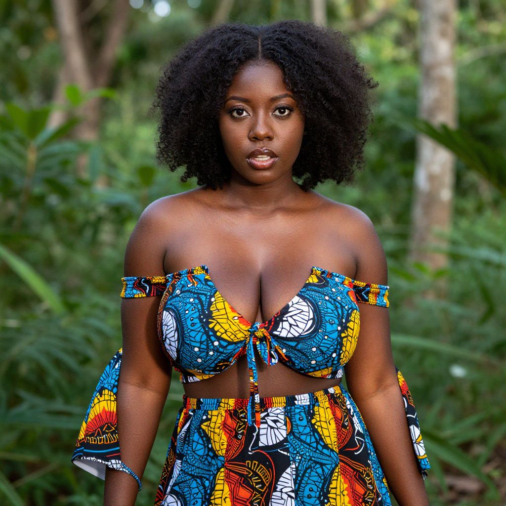A stunning woman of African descent with voluminous, naturally curly hair steps out of a jungle clearing in Cameroon, dressed in a vibrant, modern African-inspired costume with flowing fabrics and bright tribal designs, her face expressive and full of spirit, with deep brown eyes and a confident gaze.. The woman has big tits and cute face