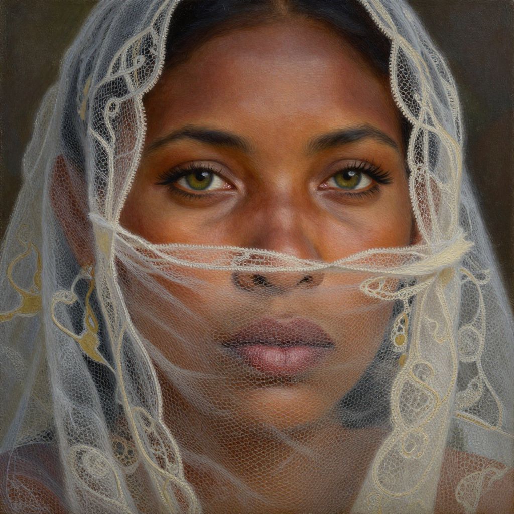 Create a hyperrealistic oil painting portrait of an Aboriginal woman with a unique perspective, focusing on her wistful green eyes and delicate features. Drape a lace veil over her face, capturing the subtle interplay of light and shadow across her skin. Emphasize the intricate details of her eyelashes and lips, as well as the sensitive texture of the veil. Convey an emotional spectrum from vulnerability to resilience in this enigmatic subject.