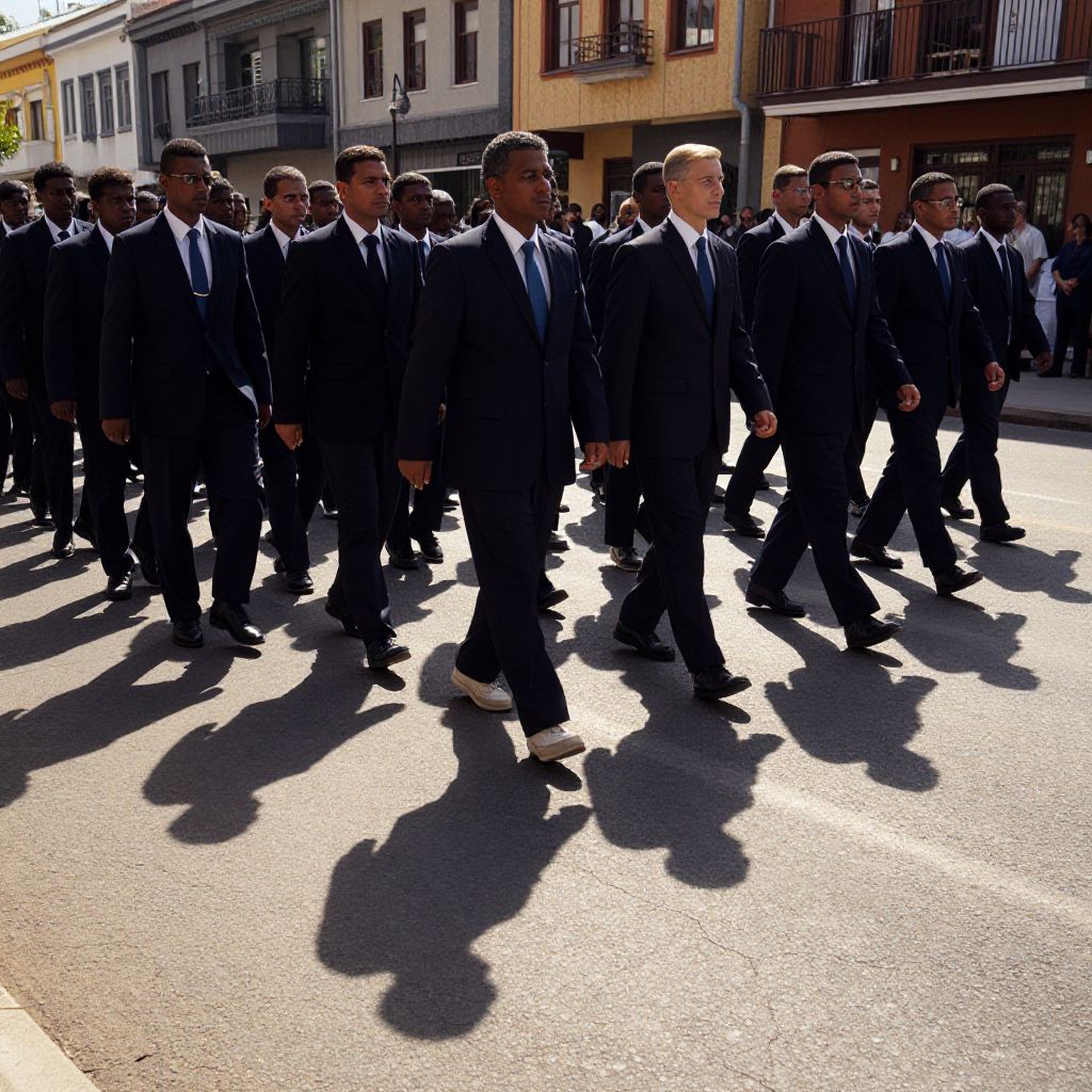 Photograph of a group of approximately 20 young Black men in dark suits, white shirts, and ties, walking in a line on a sunlit street. Their shadows cast long and prominent on the pavement. The men have short haircuts and are all wearing black dress shoes. In the background, there are multi-story buildings with balconies and storefronts, suggesting an urban setting. The bright sunlight creates stark contrasts and highlights the men's formal attire. The street is empty except for the group, adding a sense of purposeful movement.