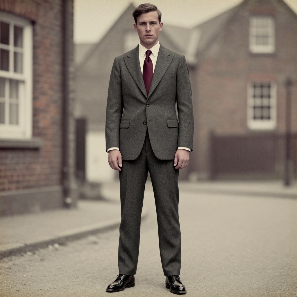 A man, charcoal gray suit, textured fabric, slim-fit silhouette, ivory dress shirt, burgundy silk tie, black patent leather shoes, historic brick buildings, hand-tinted photograph, confident expression Man has masculine face and piercing eyes
