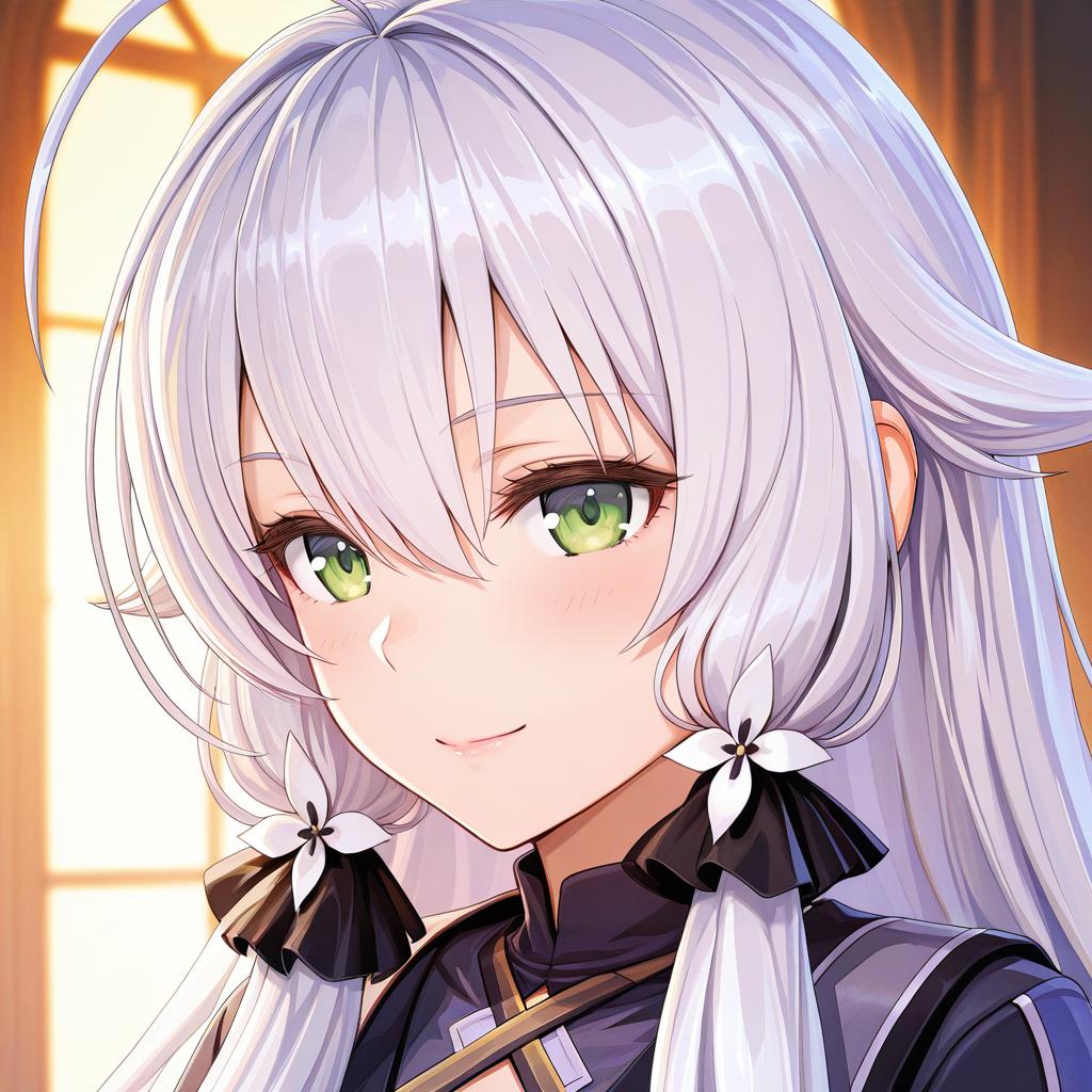 Close-up illustration of a female anime character with very long white and grey hair, styled with sidelocks and hair flaps. She has striking green eyes and a slight smile. The character wears a dark outfit with a high collar, decorated with white floral hair accessories tied with black ribbons. The warm background suggests an interior setting with soft light coming through a window.