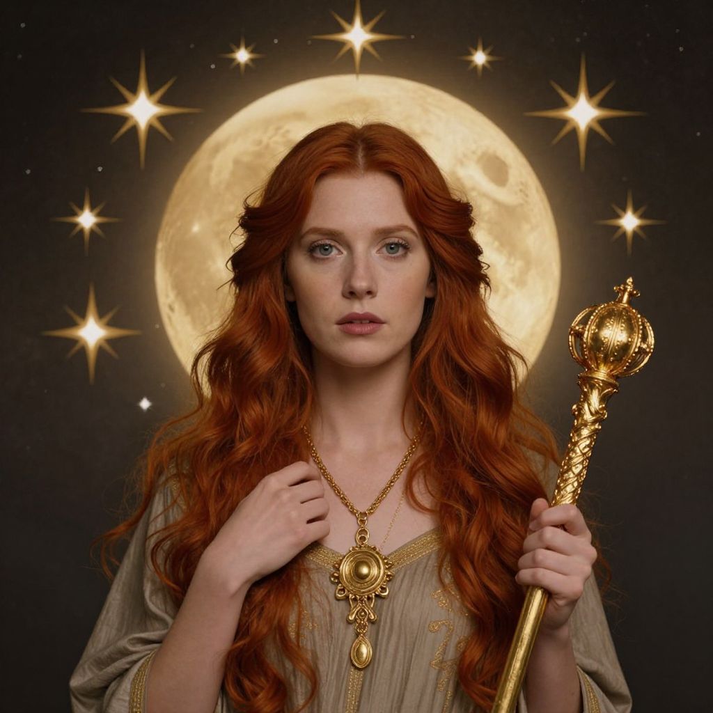 Evelyn De Morgan's ethereal portrait depicts a woman with vibrant red hair cascading over her shoulders, set against a mystical backdrop featuring a golden full moon and eight radiant stars, while she holds a golden scepter in her left hand and delicately touches a gold necklace with her right, exuding an air of regal mysticism.