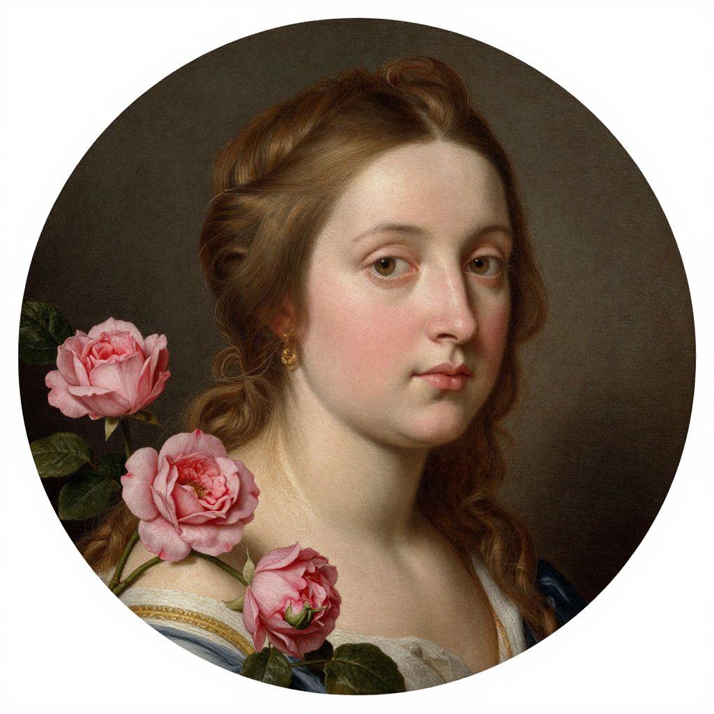 Baroque-style portrait of a fair-skinned woman with wavy brown hair, wearing a blue dress, adorned with red and white roses.