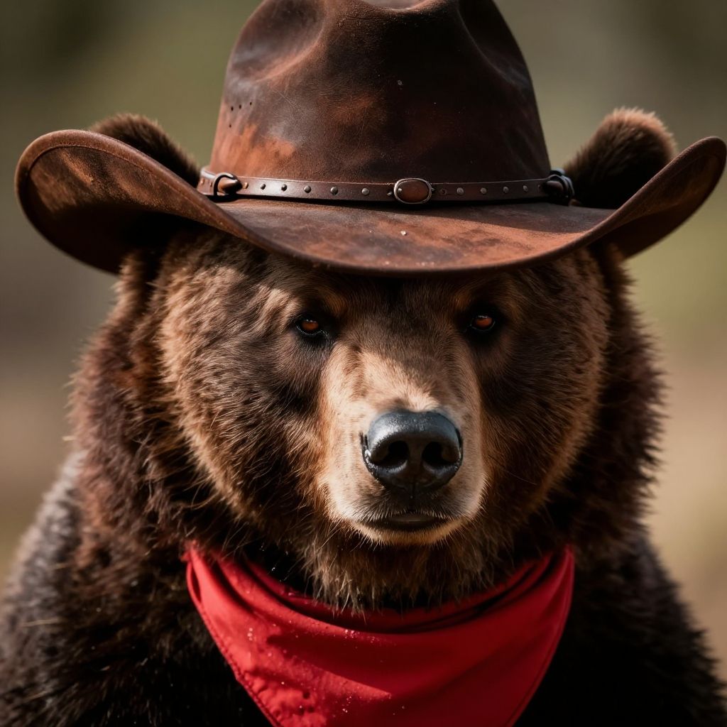 Photograph of a brown bear with dark, dense fur, wearing a brown, worn leather cowboy hat with a black stitched band and a bright red bandana around its neck. The bear's eyes are slightly narrowed, and its black nose is prominently centered. The background is blurred, featuring muted greens and browns, suggesting an outdoor forest setting. The bear's expression is calm yet intense, with sunlight highlighting its fur and face. The overall style is realistic with vibrant colors and sharp details.
