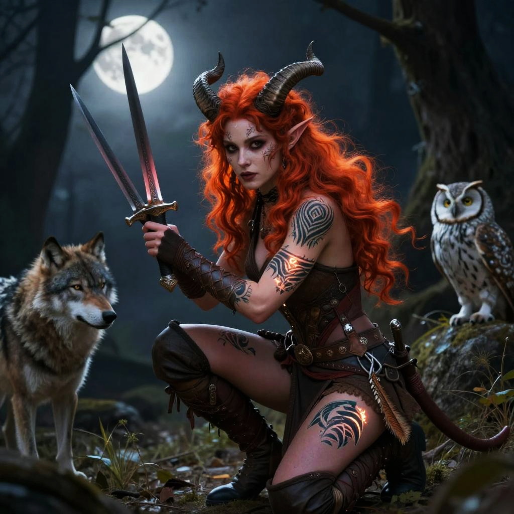 Tiefling ranger female crouched stealthily in a moonlit glade, her fiery red hair flowing around shadowy horns, holding twin daggers, with animals like wolves and owls nearby, intricate tribal tattoos glowing faintly on her skin, hyper-realistic fantasy style with rich colors.