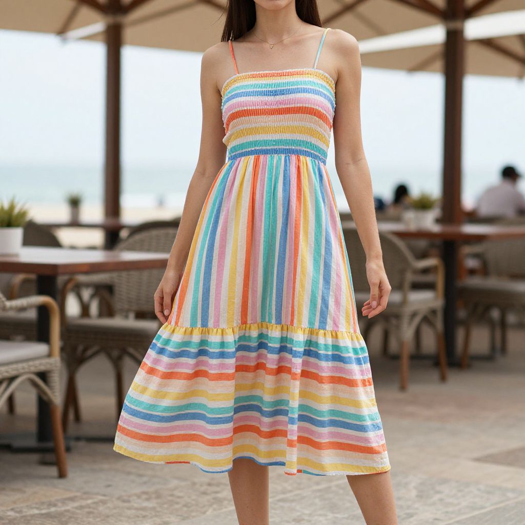 Woman, casual summer, multicolored striped sundress, spaghetti straps, knee-length, flowing fabric, straight hair, no visible accessories, standing, beachside cafe background.