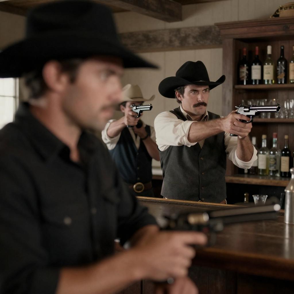 Photograph of a western bar scene. Foreground: man with black shirt, black hat, gun in hand, blurred. Background: two men in white shirts, vests, cowboy hats, one with mustache, standing behind bar, both aiming guns. Bar has bottles, glasses, wooden shelves. Dim, rustic setting. Intense expressions.