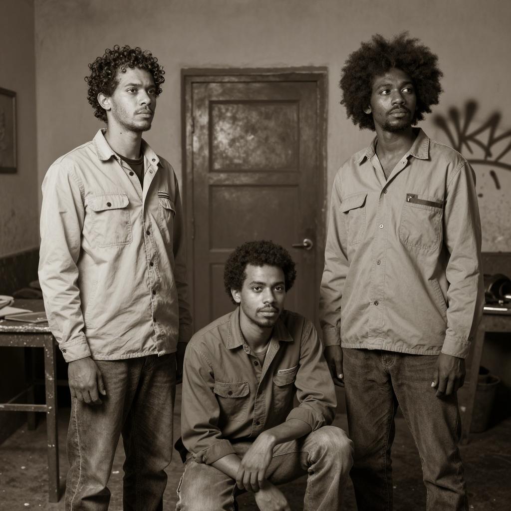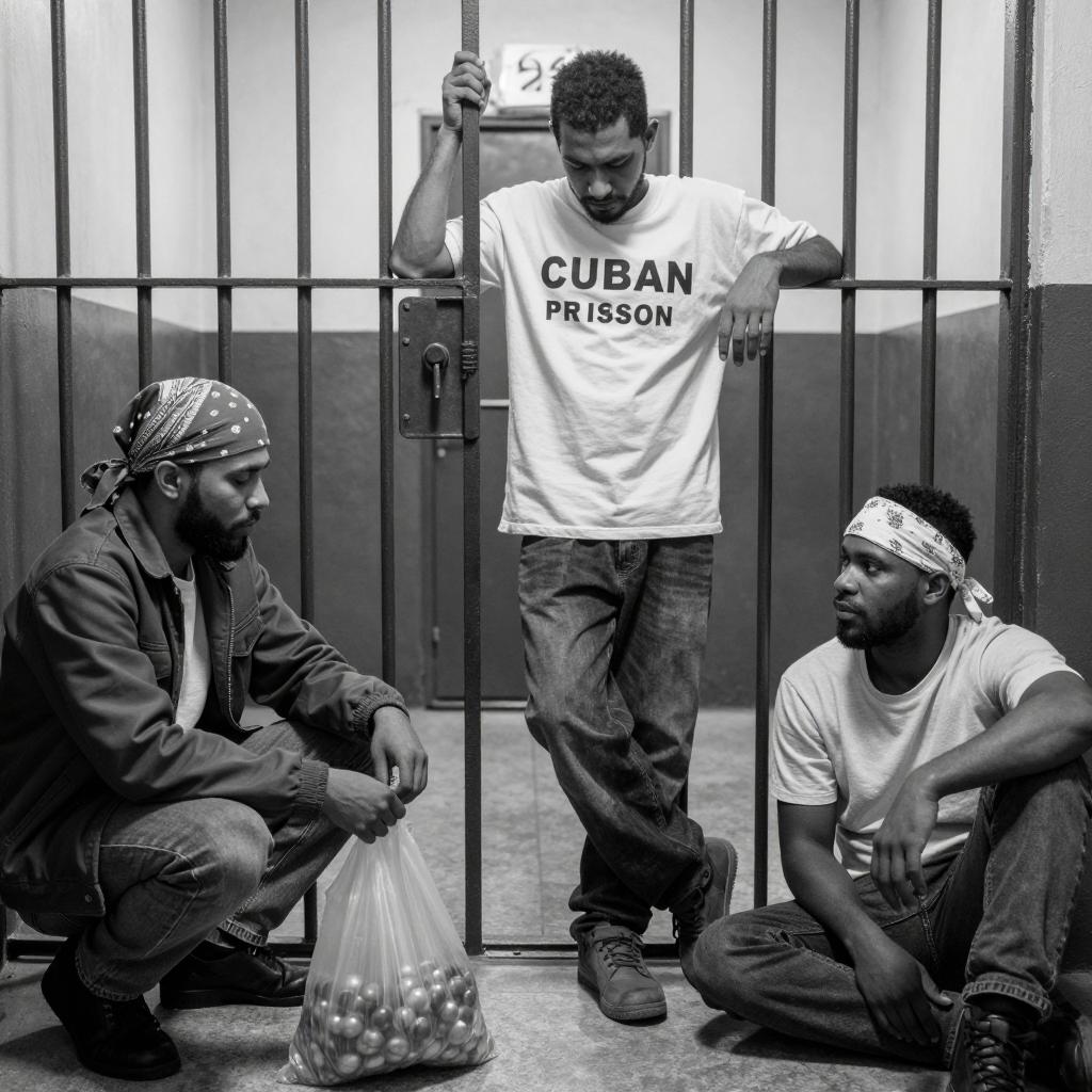 Black and white photograph of three men in a prison cell. Man on left wears a headscarf, jacket, and crouches by a clear plastic bag. Center man with "Cuban Prisoner" shirt leans against bars. Right man wears headband, sits on floor, looks to the side. Metal bars fill background.