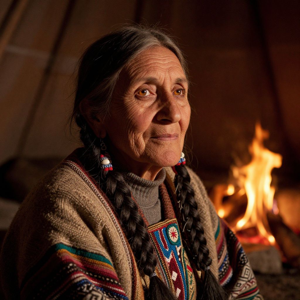 Photograph of an elderly Indigenous woman with long, dark braided hair, wearing a colorful, patterned blanket with geometric designs and beaded jewelry. Her weathered face has deep wrinkles and she gazes softly into the camera. She is illuminated by the warm, flickering light of a fire in the background, which creates a cozy, intimate atmosphere. The background is blurred, highlighting her face and traditional attire. The firelight casts shadows that enhance the textures of her skin and the knit of her clothing. The overall composition evokes a sense of cultural heritage and warmth.