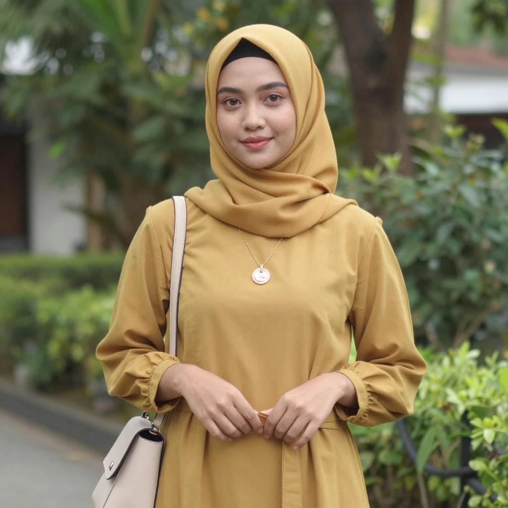 Photograph of a young Asian woman with fair skin and brown eyes, wearing a mustard-yellow hijab and long-sleeve dress. She holds the dress's belt with both hands, a gold necklace with a circular pendant around her neck, and a small beige handbag on her right shoulder. She stands outdoors in a lush, green garden with sunlight filtering through the trees.