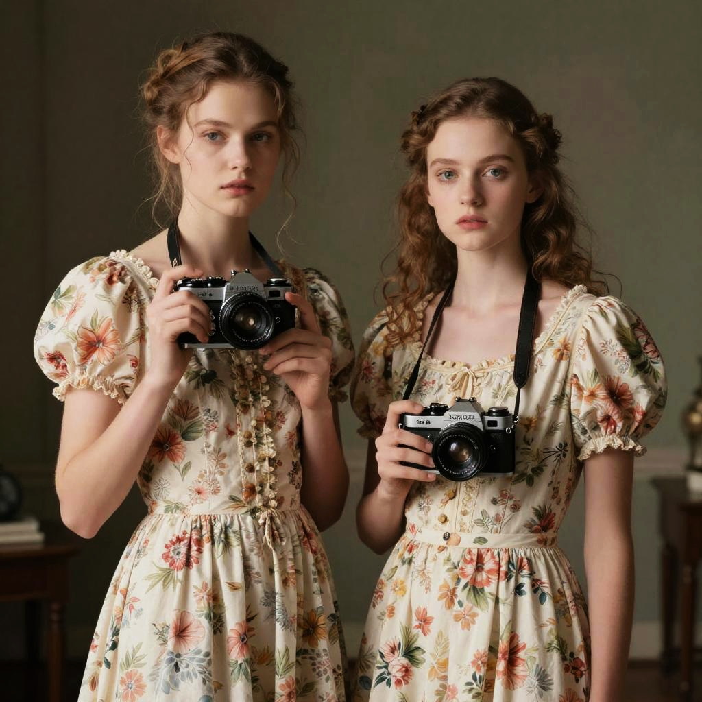 4k, UHD, absurdres, hyperrealistic modelshoot style photograph by irving penn[ Bernadette Lafont|Jordyn Huitema] wearing { button-up vest, pinstripe trousers, and fedora hat | khaki pants, striped shirt, and boat shoes | corset, velvet skirt, and combat boots | floral dresses with puffed sleeves and empire waists }, Konica Hexar AF Camera, masterpiece, award winning photography, lighting, perfect composition, high detail, hyper realistic, dramatic lighting, epic, short depth of field