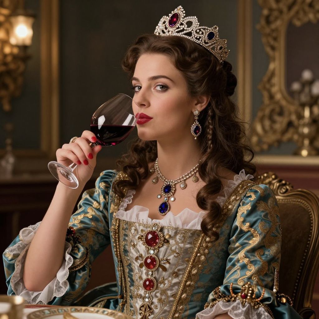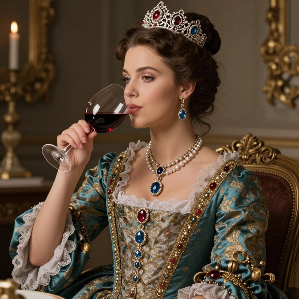 A digitally rendered illustration depicts a woman in opulent Baroque-inspired attire, adorned with intricate jewelry and a tiara, elegantly sipping red wine in a luxurious setting with dramatic lighting and vintage ambiance.