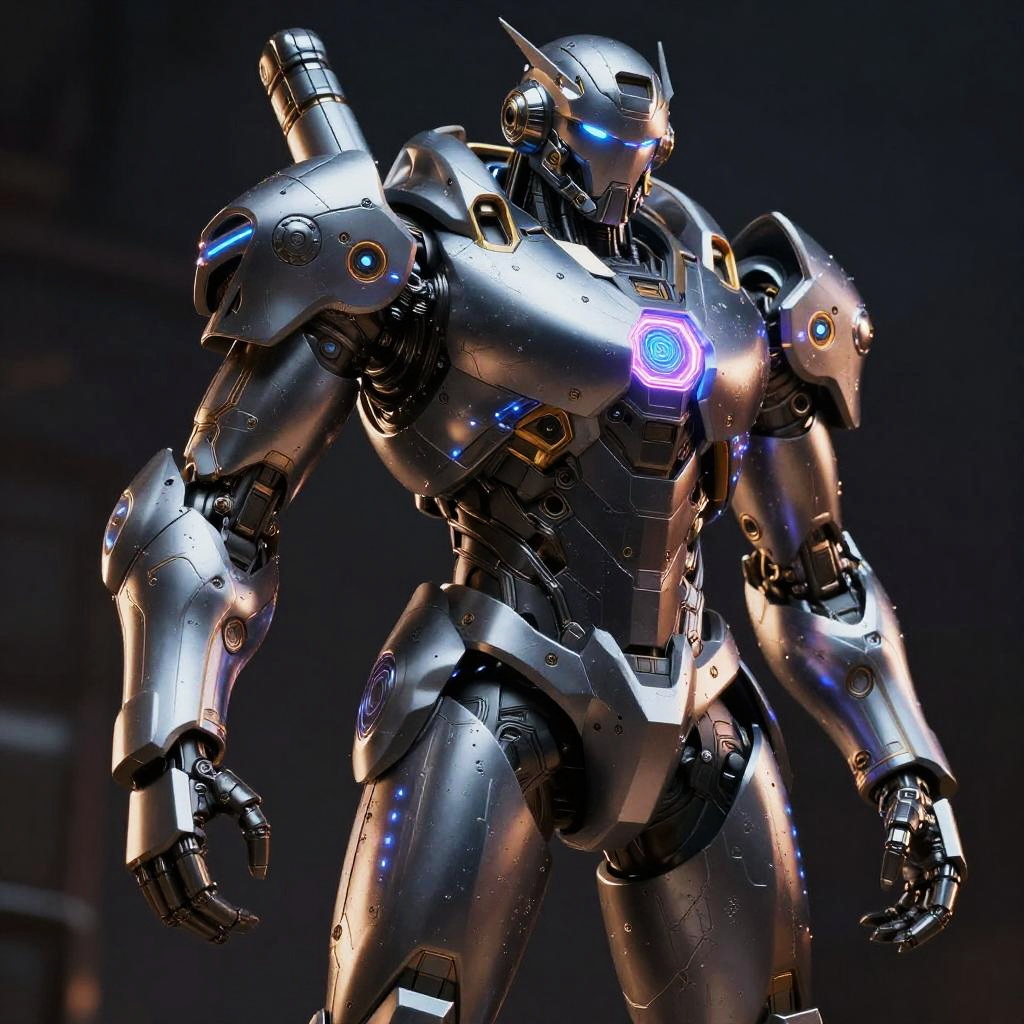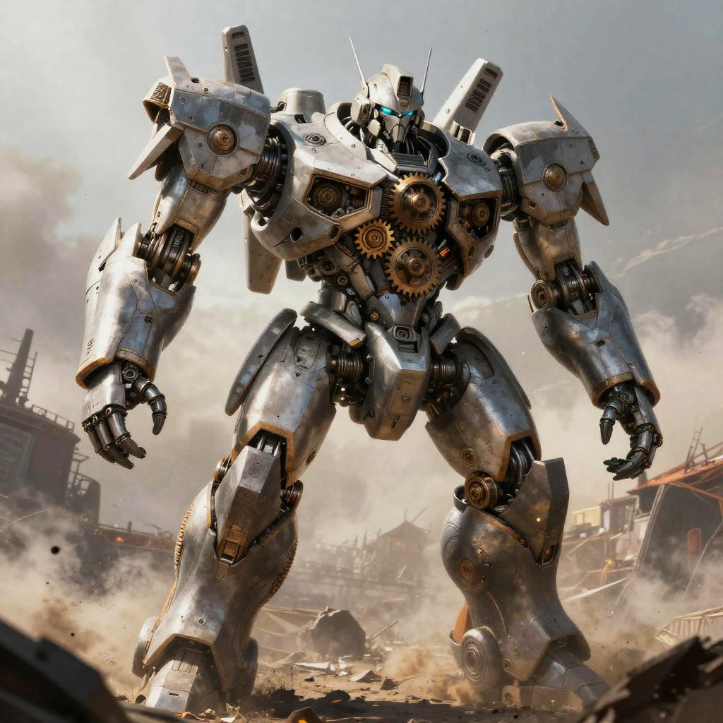 Realistic power armor standing in a post-apocalyptic cityscape, battle-worn with rust and dirt, intricate mechanical joints, steam and smoke effects, hyper-realistic rendering, sharp focus