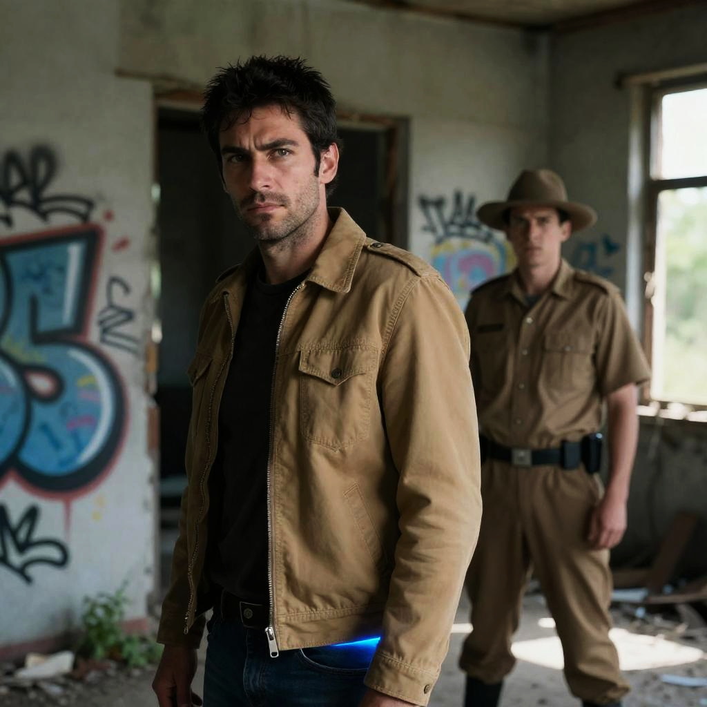 Black and white split image featuring on the left, a dramatic movie poster with an intense male face wearing a dark fedora hat surrounded by several chaotic figures in the background. On the right side, three men in casual clothing with serious expressions, two wearing detailed lizard masks while one stands and two kneel against a rustic wooden building backdrop. Both images evoke intensity and mystery.