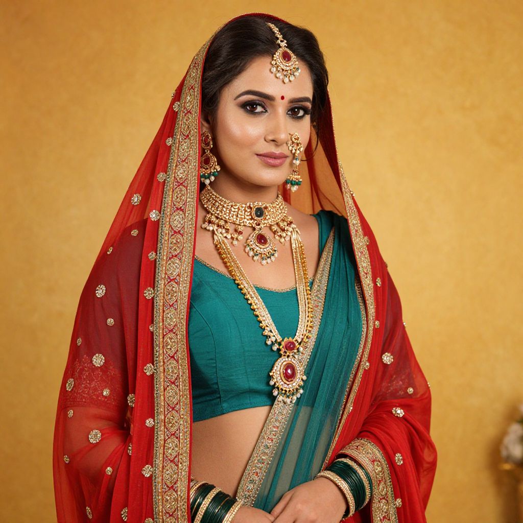 Radiant portrait of a woman adorned in traditional Indian attire, featuring a vibrant red dupatta embellished with golden borders, layered over a teal blouse and sari, complemented by intricate jewelry including a forehead ornament, dangling earrings, multiple necklaces, and bangles, set against a warm, textured yellow background.