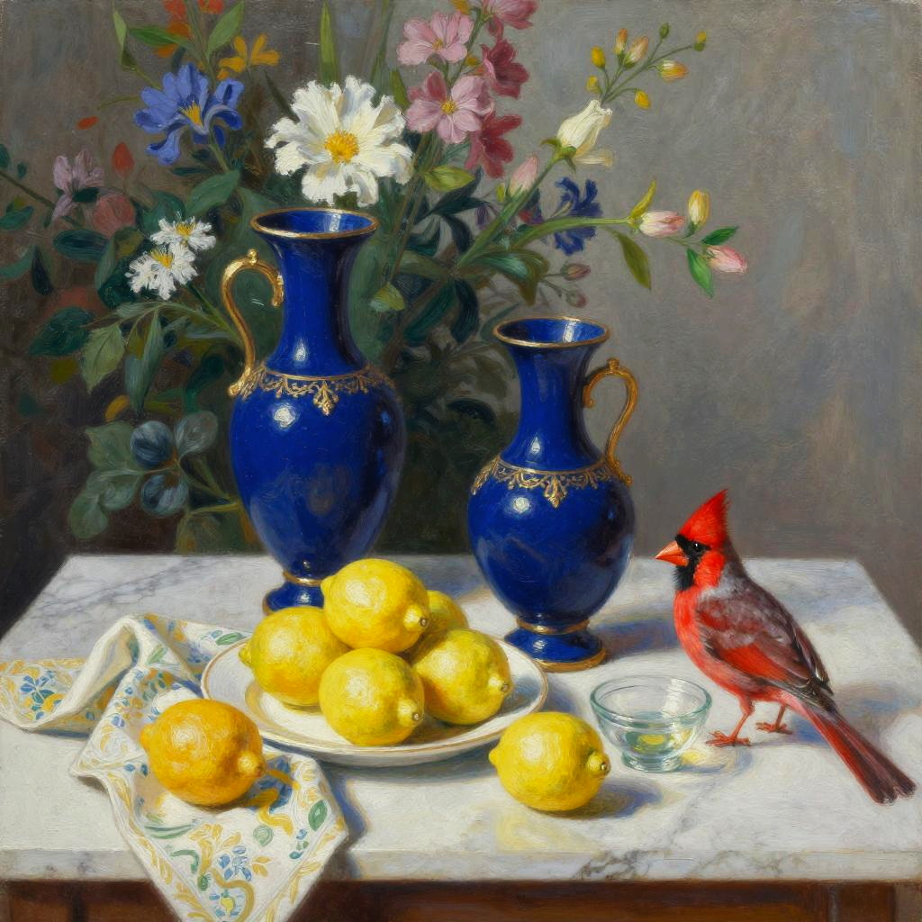 A classical still-life painting depicts two ornate, golden-yellow ceramic vases with intricate designs, standing beside a marble-topped table. A white plate filled with bright yellow lemons is in front, with a small glass bowl containing a single lemon slice to the left. A vibrant yellow bird with white wingtips perches on a yellow, patterned cloth draped over the plate. Behind the vases, a lush bouquet of white, pink, and red flowers adds color contrast. The background is dark, making the vibrant elements pop. The painting style is realistic and detailed, emphasizing texture and color.