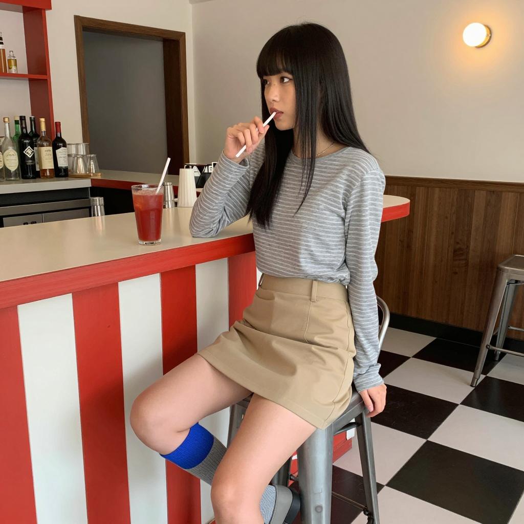 Asian woman with straight black hair and blunt bangs, wearing a gray striped long-sleeve shirt and beige A-line skirt. She sits on a metal bar stool, leaning against a counter, holding a red drink with a straw in her right hand. She wears blue and gray knee-high socks and gray shoes. Red and white striped counter in foreground, black and white checkered floor in background. Bar with various bottles and glasses behind her. Casual, slightly retro style.