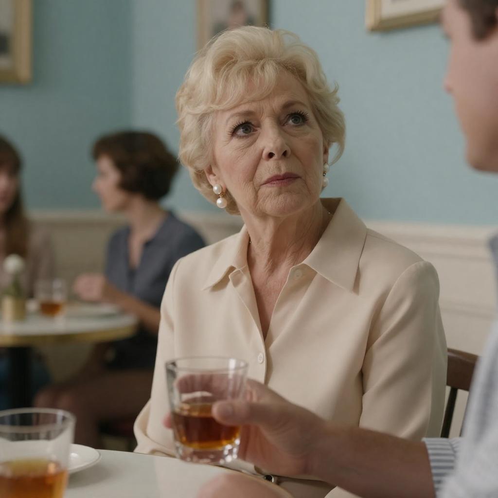 Photograph of an older woman with short, blonde, wavy hair, wearing a green, ribbed sweater. She has a focused, intense expression, looking to the right. A blurry older man with an open mouth stands in the background.