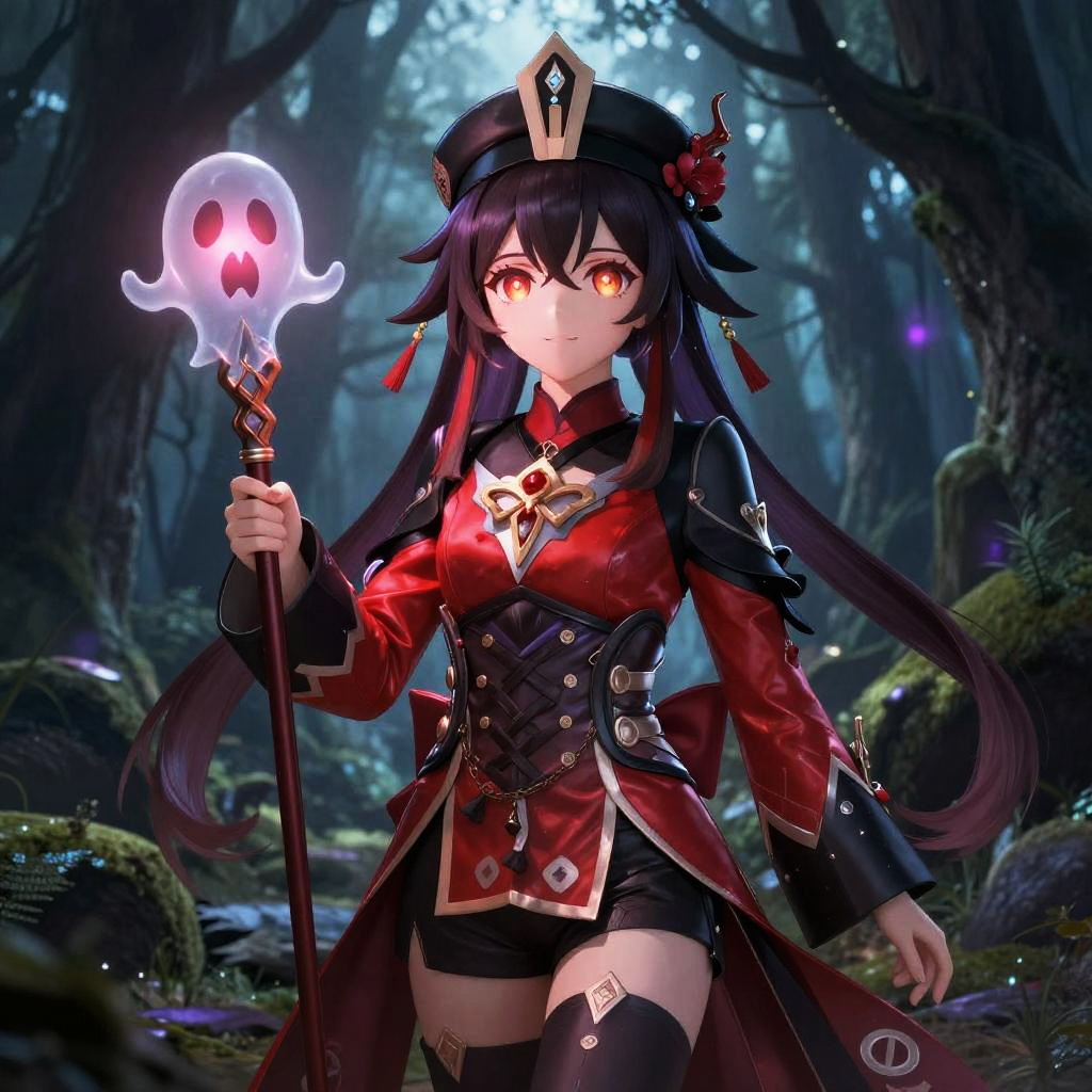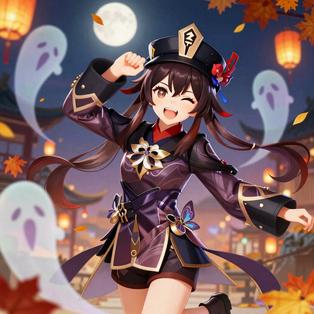 Sexy Hu Tao in traditional Chinese attire with a playful and mischievous expression, surrounded by autumn leaves and ethereal ghost spirits, vibrant colors, detailed anime style, dynamic pose, fantasy background with lanterns and moonlight.